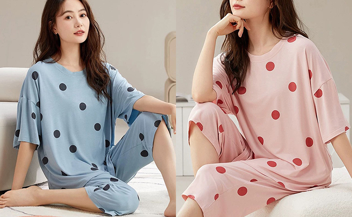 캡내장 핑크블루 땡땡이 반팔잠옷 7부바지 파자마 상하세트