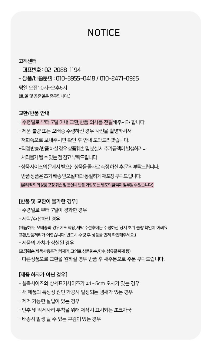 *상품문의를 제외한 교환/반품/취소 문의는 1:1문의하기를 이용해 주세요.